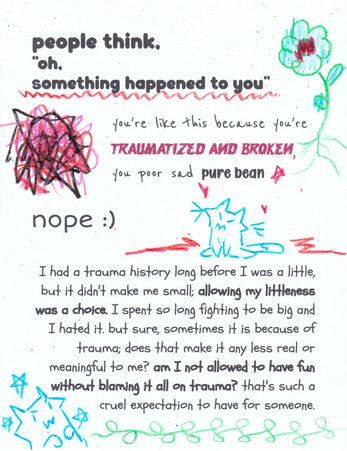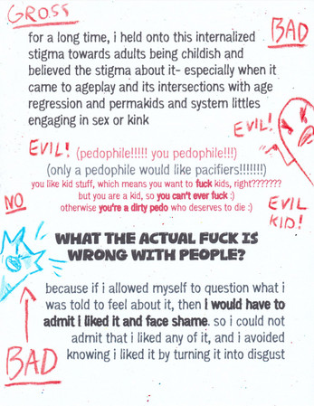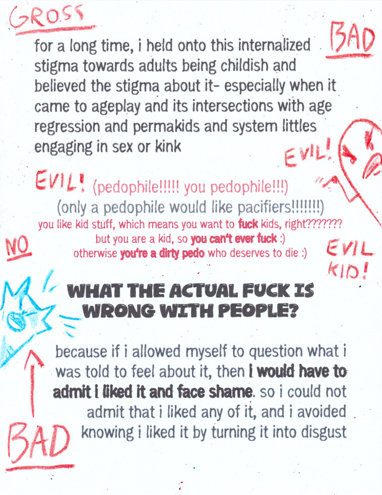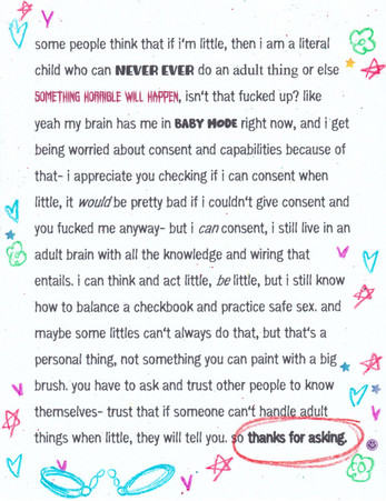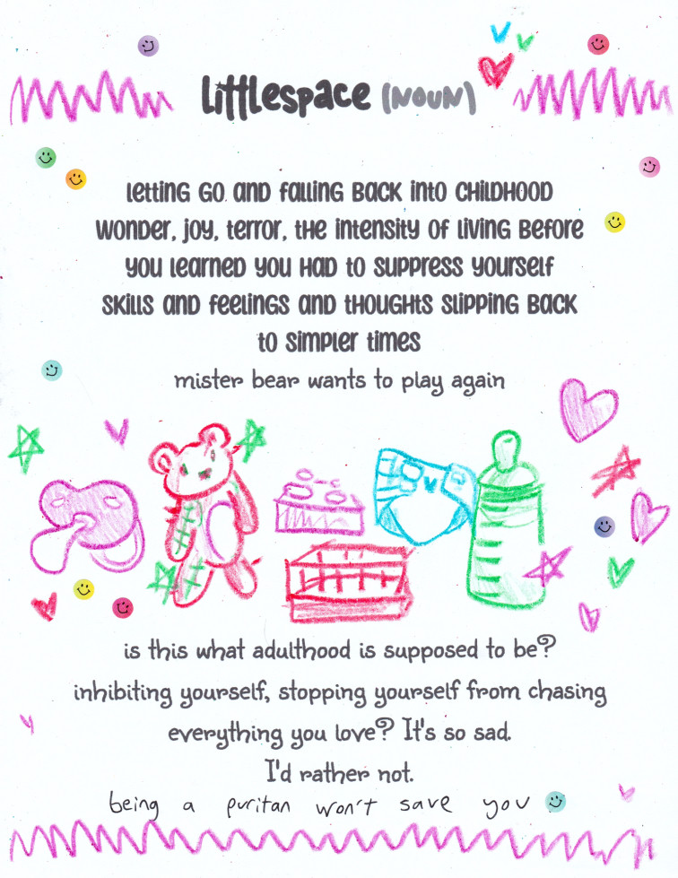 I'm one of those littles who's perfectly okay getting kinky while small, and the larger internet's general inability to grasp nuance bothers me so much that I made a whole zine about littlespace and stigma, then kinky crayon-colored all over it.