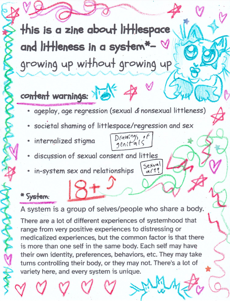 | Tags | Adult, ageplay, agere, age-regression, littlespace, Mental Health, plural, plurality, zine |